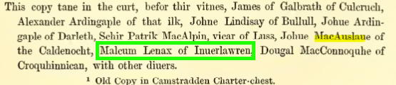 The next mention of Inverlauren was on 4th July 1395 when Malcolm Lenax of Inuerlawren was (along with Johne MacAuslane of the Caldenocht), witness to a charter between Humphrey Colquhoun of Luss and his brother Robert, in which Humphrey granted Robert the lands of Camstradden.