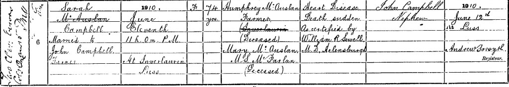 Sarah McAuslan died on 11 June 1910, at Inverlaurin in the parish of Luss. She was aged 74, the daughter of Humphrey McAuslan, Farmer (deceased) and Mary McAuslan, Maiden Surname McFarlan (deceased), and married to John Campbell, Farmer. The cause of death was Heart Disease, Death Sudden, as certified by William R. Sewell, M.D., Helensburgh.