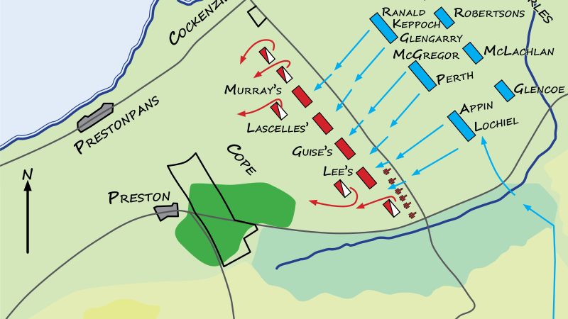 After being joined at Dunbar by Fowke and the cavalry, Cope then marched westward towards Edinburgh, confident that he would defeat the Jacobites. However, it was Cope’s army that was surprised in the early morning near Prestonpans. In less than ten minutes the unprepared Hanoverians were flying in disorder, utterly routed. Col. James Gardiner, was mortally wounded after his dragoons fled and he attempted to rally the foot. The artillery commander, Lt-Colonel Whitefoord, made his escape after being spared by Stewart of Invernahyle. General Cope also escaped and Peregrine Lascelles, Colonel of the 47th Foot, fought his way out, although most of his regiment were captured. Cope and Lascelles reached Berwick-upon-Tweed the next day with 450 survivors including Fowke and the dragoons.