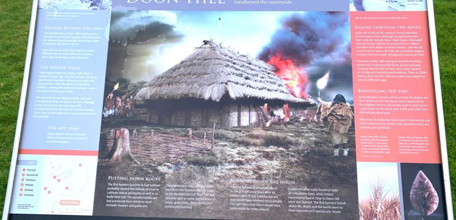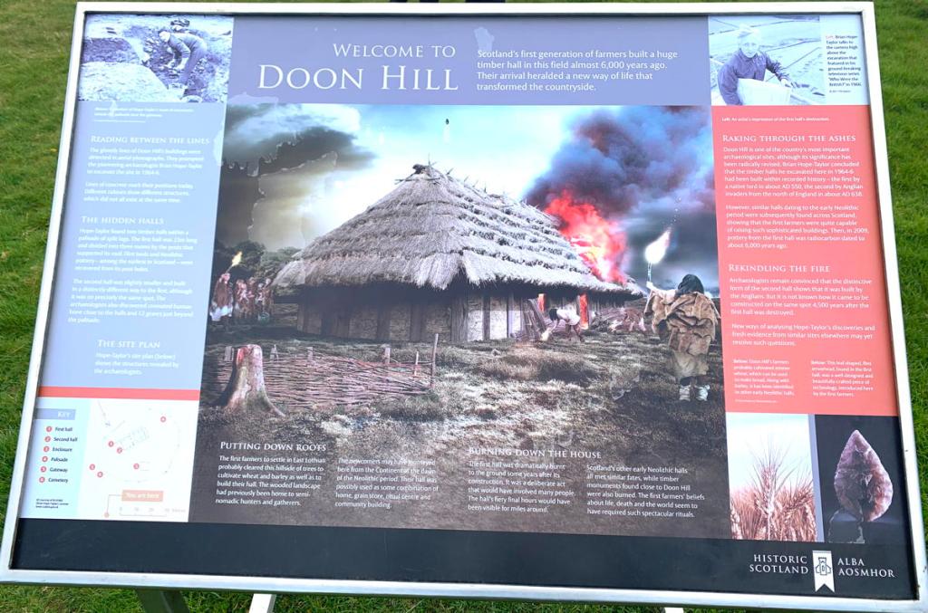Doon Hill, which is located about 500 metres east of Spott, and 3 kilometres south of Dunbar was the site of a pair of wooden halls which were first excavated between 1964 and 1966 by Brian Hope-Taylor. The later hall is believed to have been built by Anglo-Saxons around the year 640 while the older hall was originally thought to have been built by pre-Anglo-Saxon Britons. However, recent radiocarbon dating has shown the first hall to have been considerably older, dating to around 4000 BCE in the neolithic period.