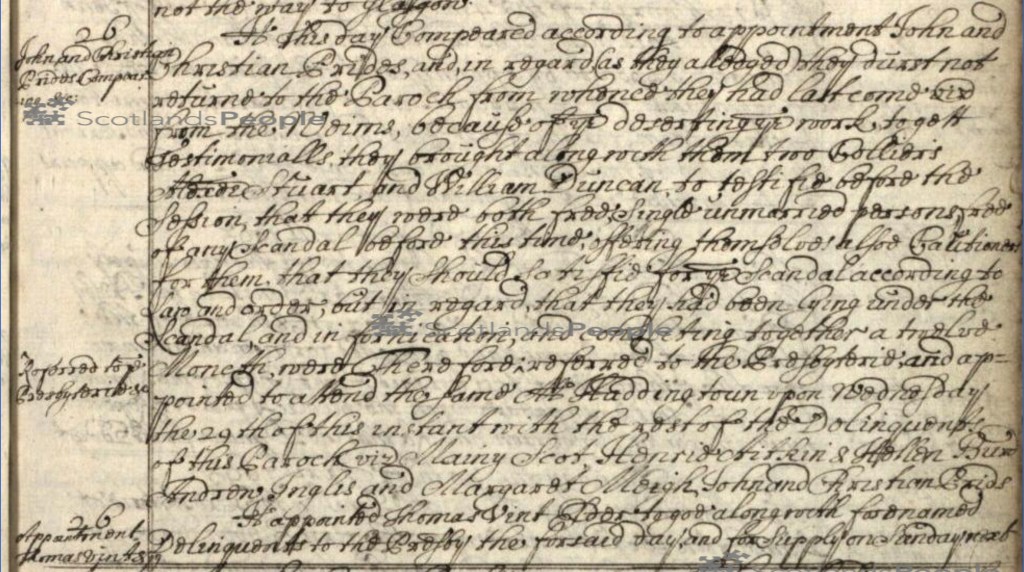 Item. This day compeared according to appointment John and Christian Prides, and, in regard, as they alleged they durst not return to the Paroch from whence they had last come, wiz from the Weims (Wemyss) because of their deserting their work to gett testimonialls they brought along with them two Colliers, Alexder Stuart and William Duncan, to testifie before the Session that they were both Free single unmarried persons, free of any Scandal, before this time, offering themselves alsoe Cautioners for them, that they should satiffie for their Scandal according to law and order, but in regard, that they had been lying under the Scandal, and in fornication, and cohabiting together a