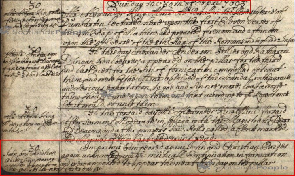 Imprimus Compeared again John and Christian prides again acknowledged mutuall Consinication in fornication and were appointed to appear the next Sunday on the pillar.