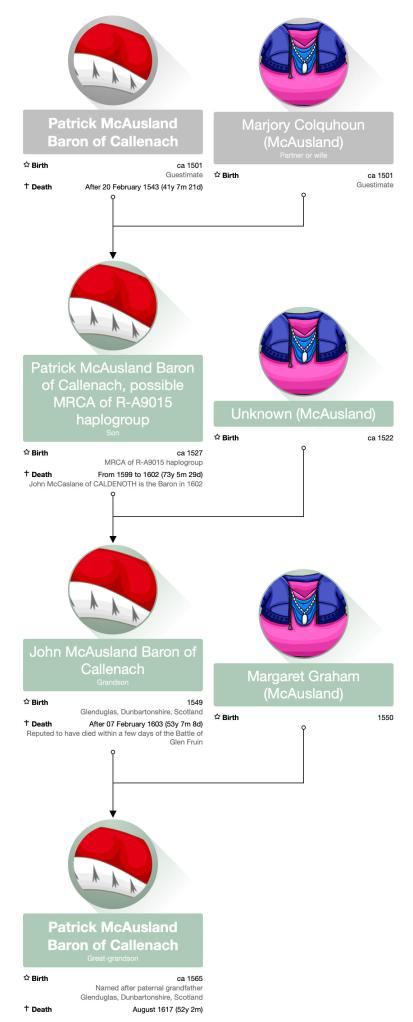 This date is of interest as, while the family tree of the McAusland Barons is not entirely certain, this MRCA might correspond to Patrick McAusland, Baron of Callenach. In 1599, Patrick was mentioned in a “Deed of renunciation by Patrick McAwslane of Caldenache in favour of Sir Alexander Colquhoun of Luss of his claim to 2/3 of Stronmaleroch, Parish of Rosneath, Barony of Luss, in return for payment by Sir Alexander of 200 merks“. (Chiefs of Colquhoun and their country By William Fraser. Edinburgh: Printed by T. and A. Constable, 1869. 2 volumes.)