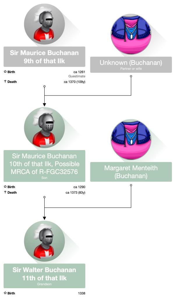 In this case, it seems possible that the MRCA of the Buchanans and McAuslands, estimated to have born in 1301, was Sir Maurice Buchanan, who according to tradition was the 10th chief of Clan Buchanan.