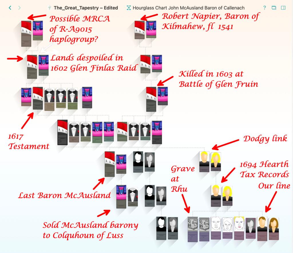 Although the precise place of our McAusland of Inverlauren line has yet to be confirmed in this rich tapestry, the framework is already in place, and we now need a suitable male McAusland to take a BigY700 test. Are there any volunteers out there?