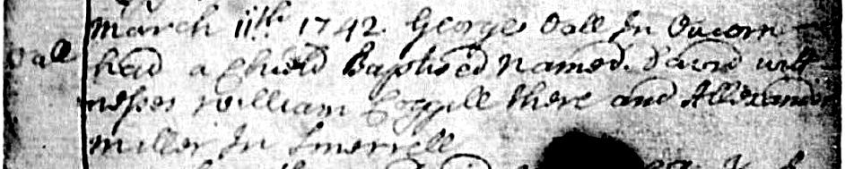 David also had a younger sister who was also born at “Owcorn” (Auchorn) and baptised on 06 May 1751. She was recorded as Hellian Oll, daughter of George Oall and again no mother was named. The witnesses to the baptism were Alexander Millar in Smyrall and Donald Robson there (i.e. Auchorn). There may have been other siblings who went unrecorded.