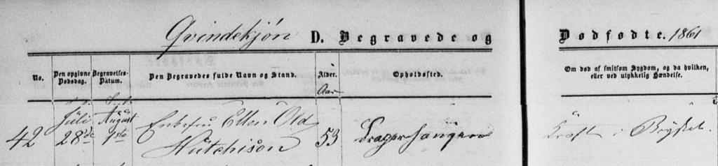 Helen died on 28 July 1861, aged 53 , an “Enkefru” or widow at Bragerhaugen in Bragernes, which is now part of the city of Drammen, in the then county of Buskerud, in Norway. The cause of death was “Kræft i brystet” or cancer of the breast. The couple had four children and one of Helen’s granddaughters, Helen Marie Hutchison, married the celebrated Norwegian photographer, Anders Beer Wilske.