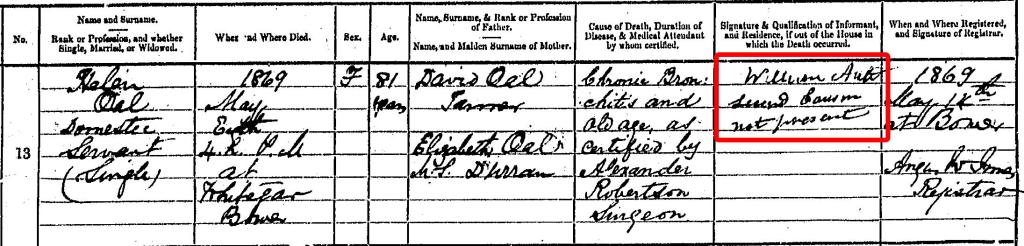 However, we can find a link a generation further back, as when Honyman’s sister, Helen Oal died at Whitegar on 8 May 1869, her death was registered by “William Auld, second cousin”. We have identified this William, who was born as William Oal at Halcro in Bower parish on 9th March 1795, the son of William Oal and Mary Manson.