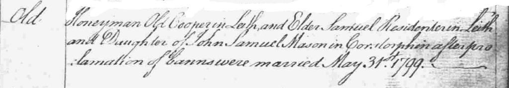 Honeyman Old was the first brick wall that I tackled in my paternal line. According to the Old Parish Register of Banns & Marriages for Leith South parish in Midlothian: “Honeyman Old, Cooper in Leith, and Elder Samuel, Residenter in Leith, and Daughter of John Samuel, Mason in Corstorphine, after proclamation of banns were married, May 31st 1799.”