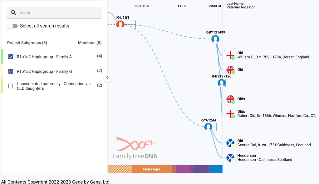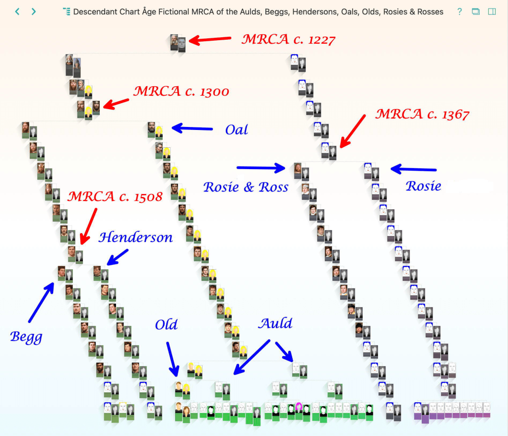 Our latest working draft of the R-Y61244 family tree from our Most Recent Common Ancestor born circa 1227 to the 1700s shows the descendant lines of Beggs, Hendersons, Olds, Aulds, Rosies and Rosses. Note that this is a dynamic tree and the MRCAs and relationships have and will change as new people take a BigY700 DNA test.