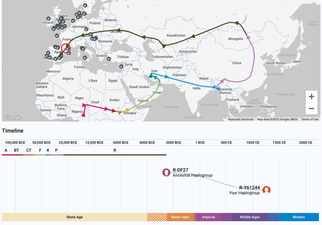 Haplogroup: These have complicated names such as R-Y61244, which can be confusing. However these are simply the equivalent of a postal code, which helps position us on the global Y-DNA tree.