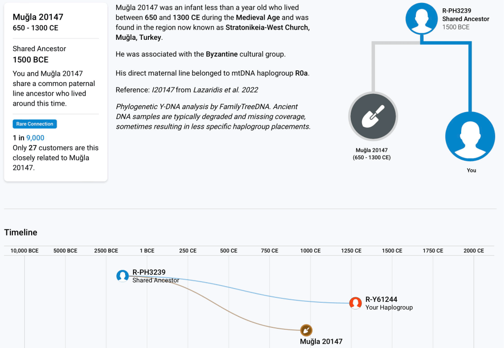 Amongst our ancient DNA connections, our closest relative is an infant from Mugla in Turkey who was born between 650 and 1300 CE, with whom we share a relatively recent MRCA of circa 1500 BCE.