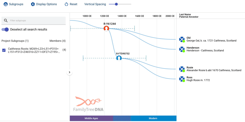 Another big surprise in our Caithness study has been that a male Rosie and a male Ross, with the ancestral name of Rosie shared a MRCA (haplogroup R-FTD90752) born around 650 years ago, circa 1367 CE. This is rather more distant than we had expected from their common Caithness ancestry and ancestral Rosie surname.