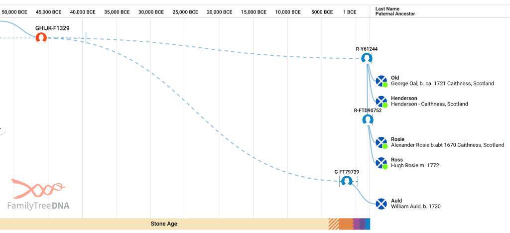 Similarly, the surname Auld appears to have evolved independently in different areas. Our Caithness Aulds and Aulds from Ireland (haplogroup I-F16721) appear to share a MRCA (GHIJK-F1329) who was born around 45,679 BCE, way back in the Stone Age.