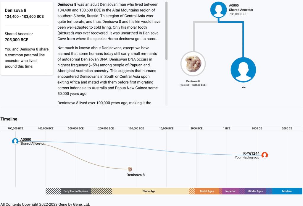 Further back, we share a common ancestor with a Denisovan male hominin, circa 705,000 BCE.