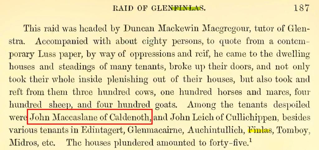 Caldenoth, the property of John McCaslane of Caldenoth, is among the list of places despoiled in the so-called Glen Finlas Raid of December 1602. As well as various properties despoiled on Loch Lomondside, others so treated included places in Glen Luss, Glen na Caoruinn and Glen Mallan, most likely giving an indication of the route taken by the raiders as they made their escape northwards. (Fraser; Chiefs of Colquhoun).