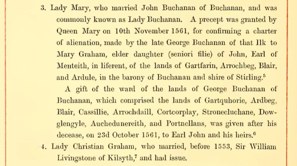 Meanwhile, on page 322 of The Red Book of Menteith, a Lady Christian Graham is also listed as their daughter. It states that Lady Mary married Sir George Buchanan that Ilk, 16th Chief of Clan Buchanan while Lady Christian married Sir William Livingstone of Kilsyth. However, as with the Scots Peerage, this source does not mention any daughter named Margaret. It should be noted, nevertheless that the 4th Earl of Menteith’s mother was Margaret Moubray, while his wife’s mother was Lady Margaret Montgomerie, and as the Scottish naming tradition was to name the eldest daughter after the maternal grandmother and the second daughter after the paternal grandmother, it would make perfect sense for this couple to name one of their daughters Margaret. However, why a daughter from one of the ancient Scottish Earldoms would marry a minor baron is somewhat less clear.
