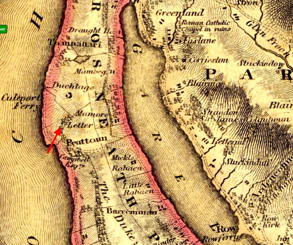 Unfortunately, the records from Row parish (not shown) do not name the specific properties. Nevertheless, it has been suggested that the properties were assessed from north to south: “Hearth Tax returns for Row Parish list names of persons with hearths, but unfortunately do not give locations. Glasgow-based Norman Easton, whose great grandfather (times 5), Patrick McInturner, was the tenant at Tombuie, has argued convincingly that in fact the list appears to form a progression, working southwards from the northern extremity of the Parish.” (The history and survey of Sròn Mallanach settlement in Argyll. Alistair McIntyre (History) and Tam Ward (Archaeology) North Clyde Archeology Society.)