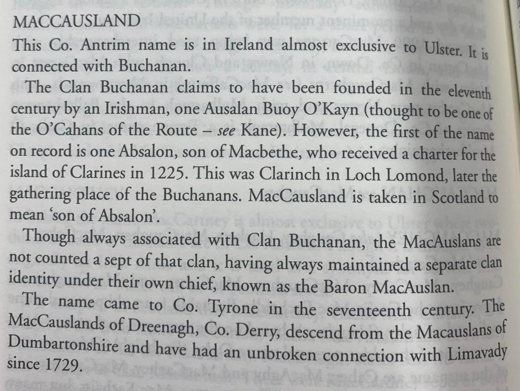 Entry for MacCausland The Book of Ulster Surnames by Robert Bell.
