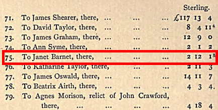 On 14 October 1731, a Commission of Inquiry declared that a number of people had proved losses sustained by the burning of Auchterarder and surrounding villages and amongst those awarded compensation was a Janet Barnet who was to get £2 12s and 1d sterling (as opposed to Scots). There is no indication that this was the same Janet Barnet who married Colin Drummond, but it does seem to be a distinct possibility. [11]