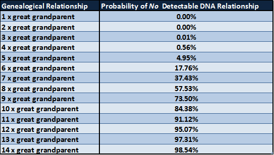 Within a few generations, we will come across some biological ancestors from whom we have inherited no DNA whatsoever. e.g. there is a probability of around 5% that we will share no DNA whatsoever with each of our 128 great (x5) grandparents. Put another way, there could be six great (x5) grandparents from whom we will have inherited no genetic material whatsoever. The number and percentage of ancestors from whom we have inherited no DNA increases sharply as we go further back in time.