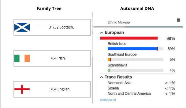 Decades of extensive research had suggested that the individual in question had entirely Scottish ancestry, at least as far back as could be researched using the Old Parish Registers. The exception was her direct maternal line where her great (x2) grandmother was born in England to an Irish mother and a father whose exact identity is yet to be confirmed, but seems likely to have been either Irish or English.