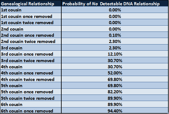 The International Society of Genetic Genealogy (ISOGG) have put together incredibly useful tables (reproduced above) that are derived from Table 1 in the paper The probability that related individuals share some section of genome identical by descent by Kevin P Donnelly, Statistical Laboratory, Cambridge University, Cambridge, England. (Source: Theoretical Population Biology 1983: 23, 34-63). (A copy of the paper is available here.)