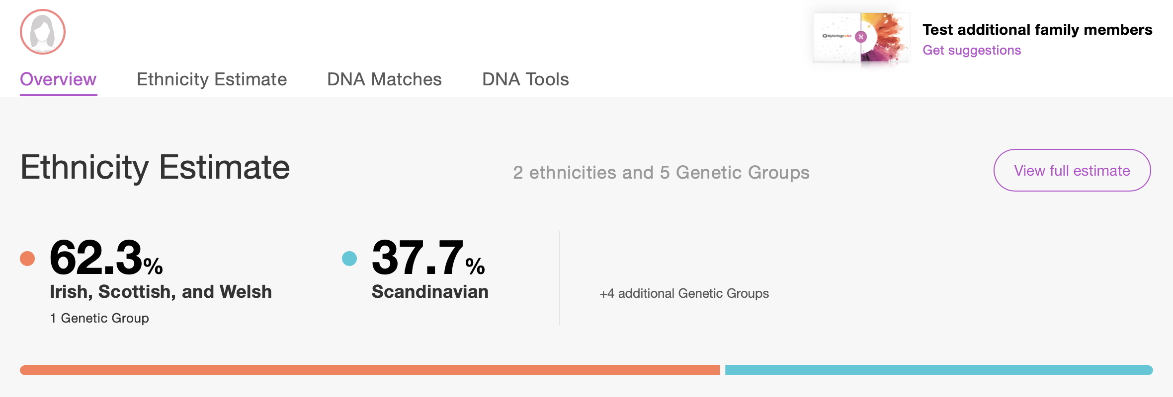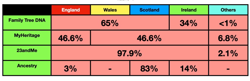 However, attempting to break down this genetic heritage from the British Isles using modern national boundaries produced some vastly different results. In the most extreme example, MyHeritage predicted that she had 46.6% English heritage while Ancestry predicted only 3% (and in Ancestry’s case England was grouped along with Northwestern Europe).