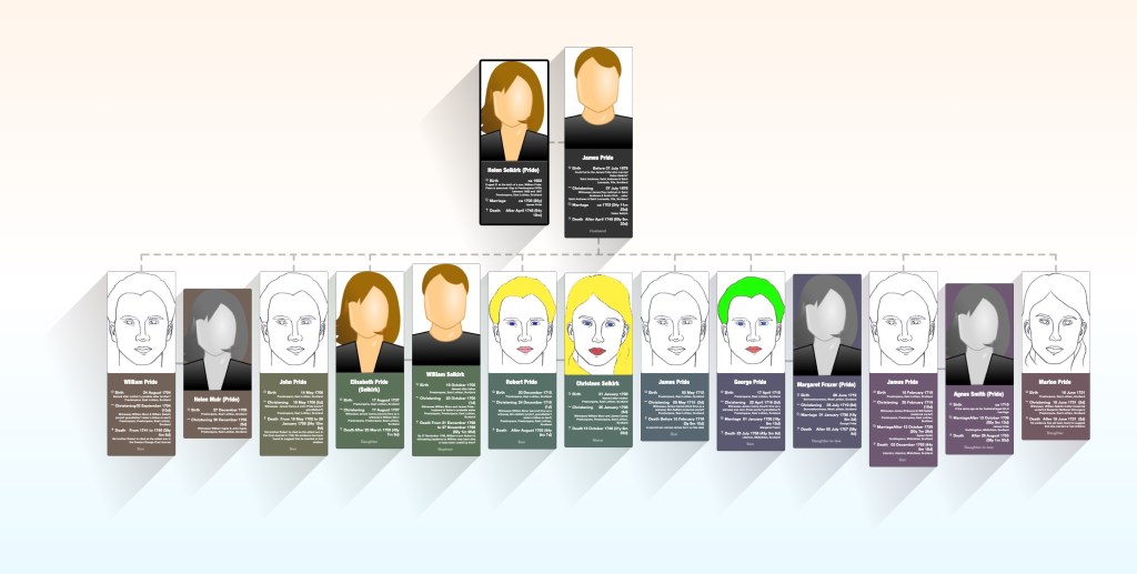 Dr Iain G. Old of Vecchio DNA and Eve Pryde-Roberts, author of A Pride of Prydes, spent several years analysing all the available data, including DNA matches as they have become more available. In addition to other areas of research they have also conducted an in-depth analysis of the witnesses to the baptisms of the children of James Pride and Helen Selkirk, of William Selkirk and Christian Gray and of a number of other connected families. They concluded that William and Helen Selkirk were likely full siblings and that both were the children of Nicol Selkirk and his second wife, Beatrix Smith, with Helen’s baptism not being recorded due to a gap of several years in the Old Parish Register of Births & Baptisms for Prestonpans parish.