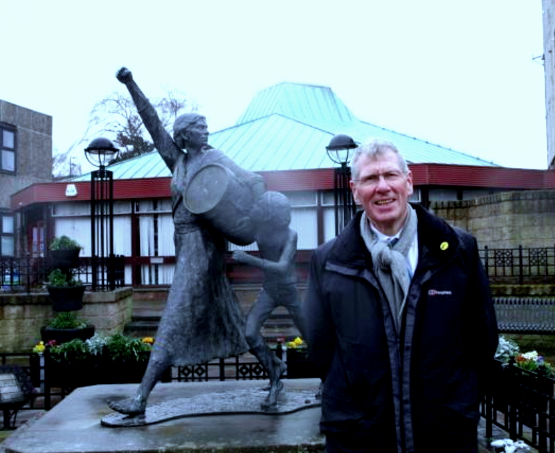at the statue of Joanna Crookston, Civic Square Tranent, February 2020