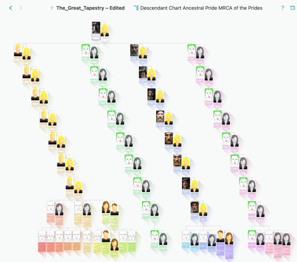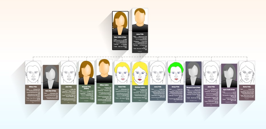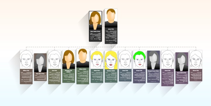 Hourglass chart showing Helen Selkirk, her husband James Pride and their children and spouses, plus confirmed Y-DNA (green) and potential (yellow) autosomal DNA links.